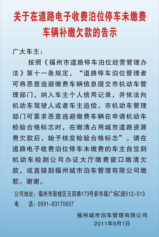 关于在道路电子收费泊位停车未缴费车辆补缴欠款的告示
