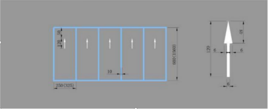 3、规格:箭头全长1200mm,箭头三角部分长480mm,箭头柱状部分宽60mm(具体见图例),居中,箭头指向车辆行进方向,同一路段同一侧泊位印刷方向须保持一致。